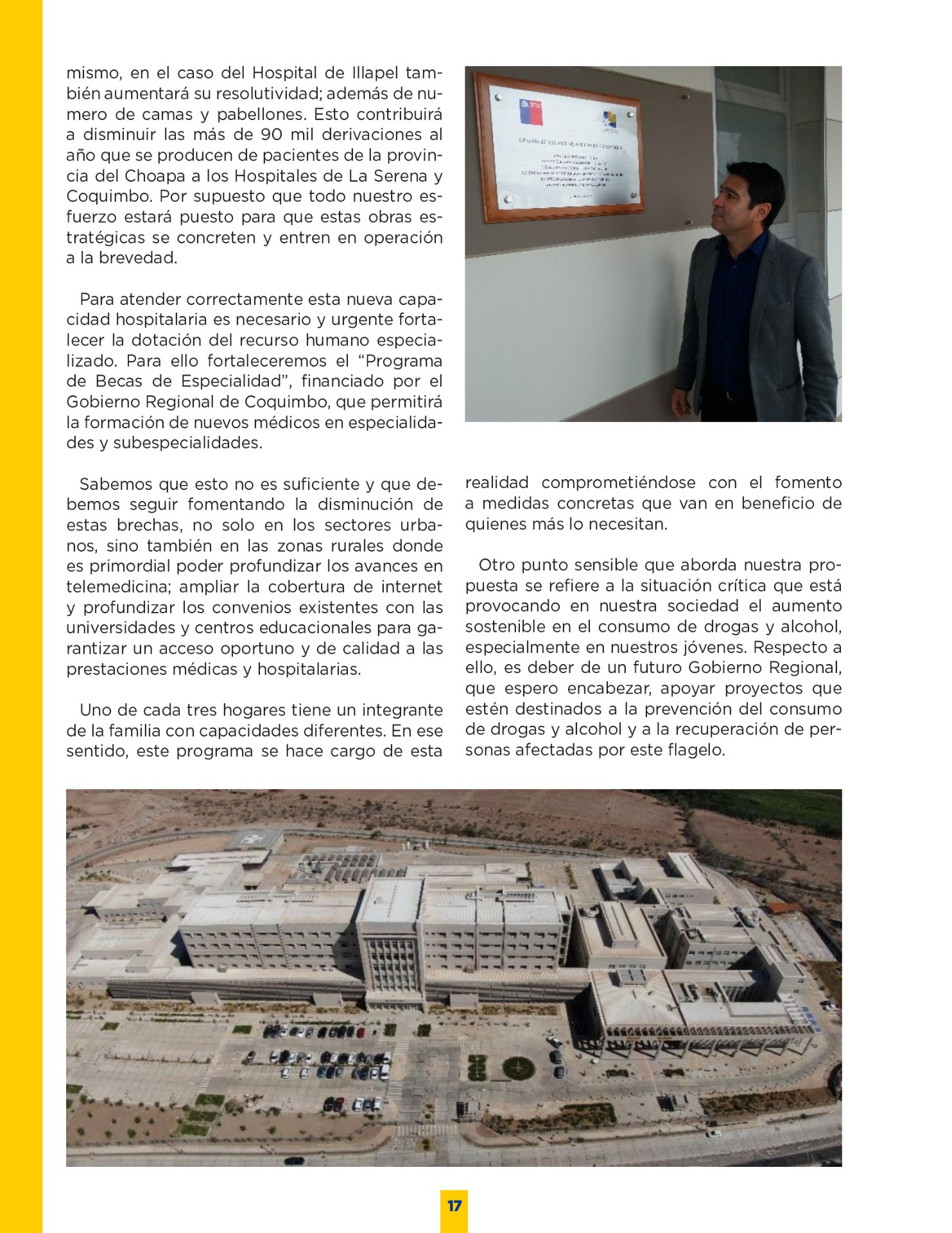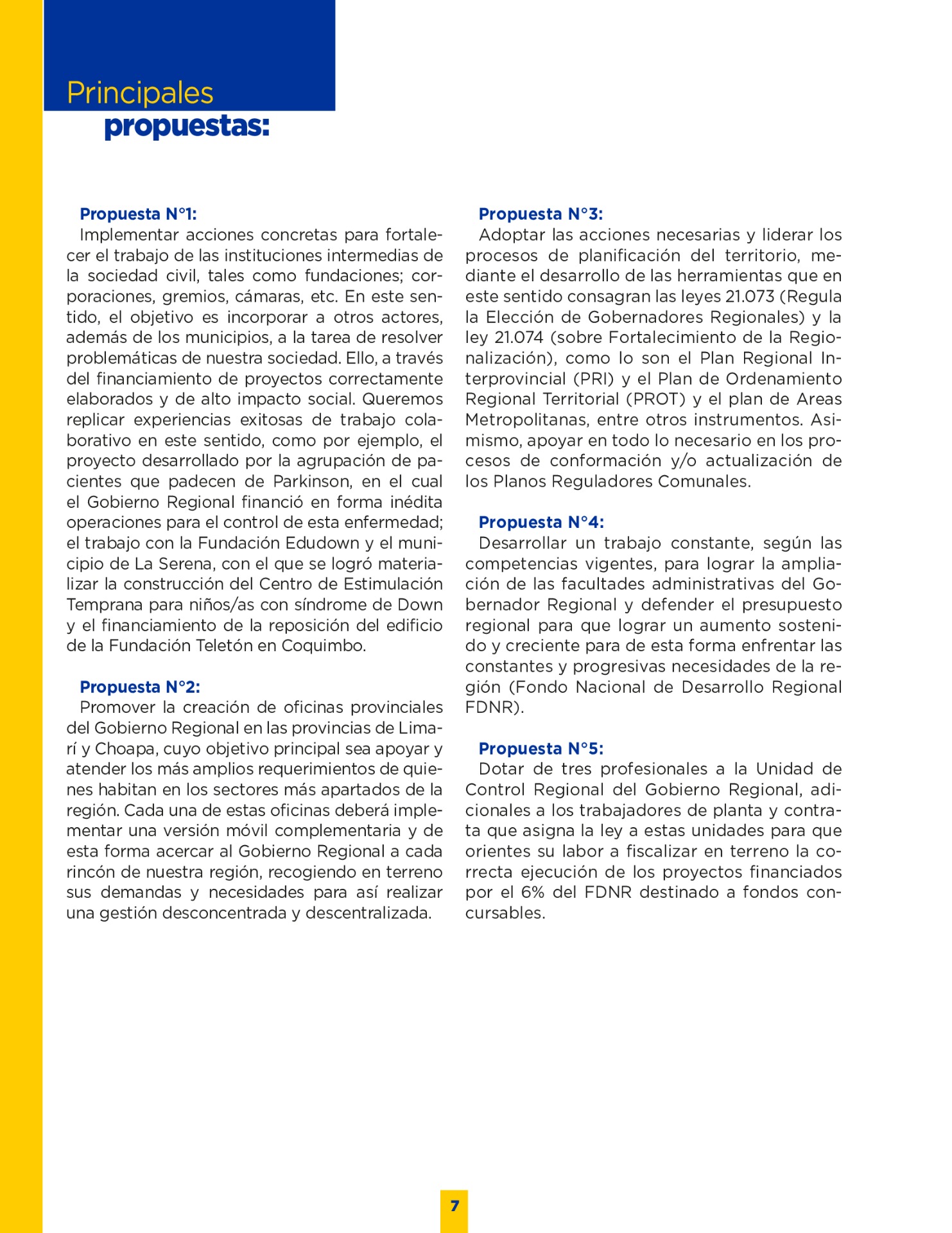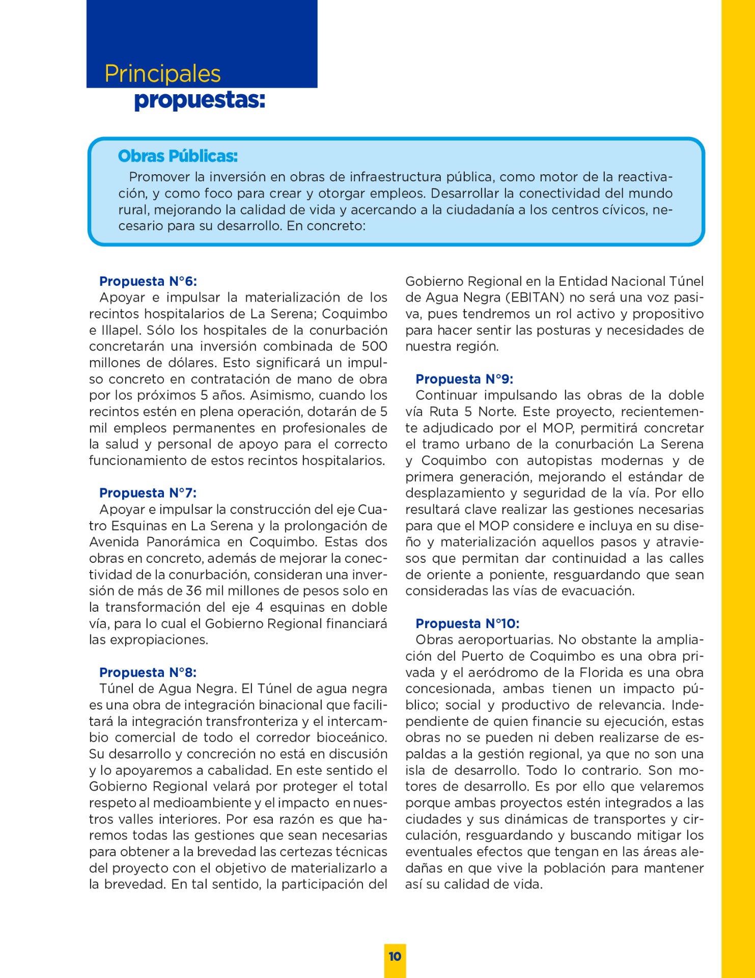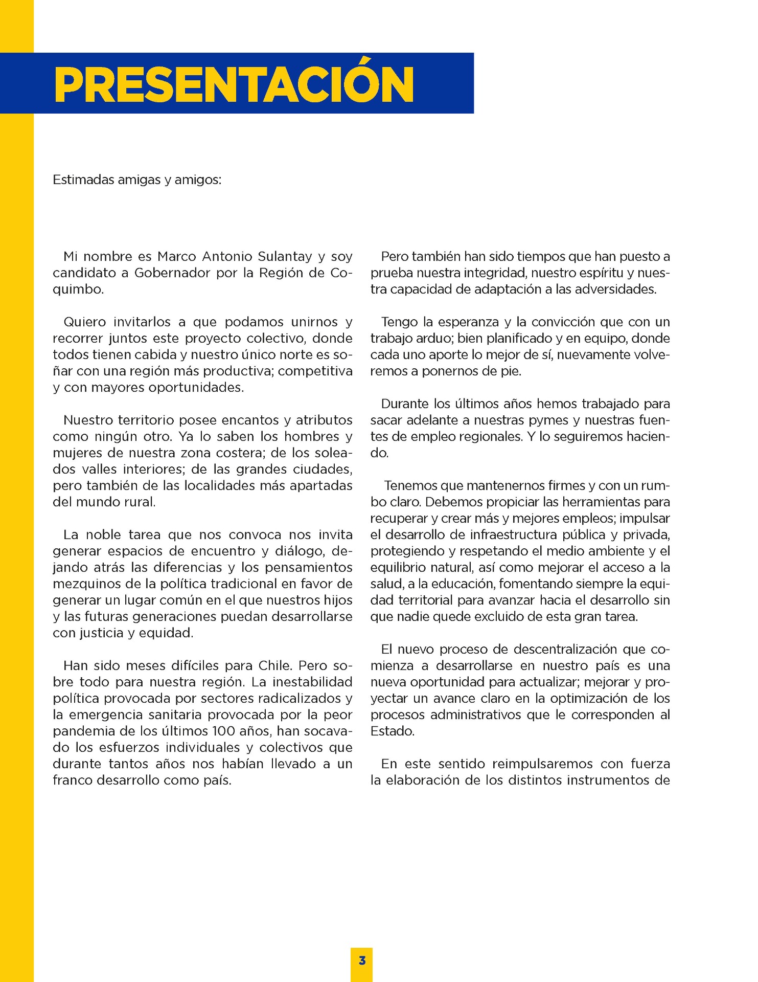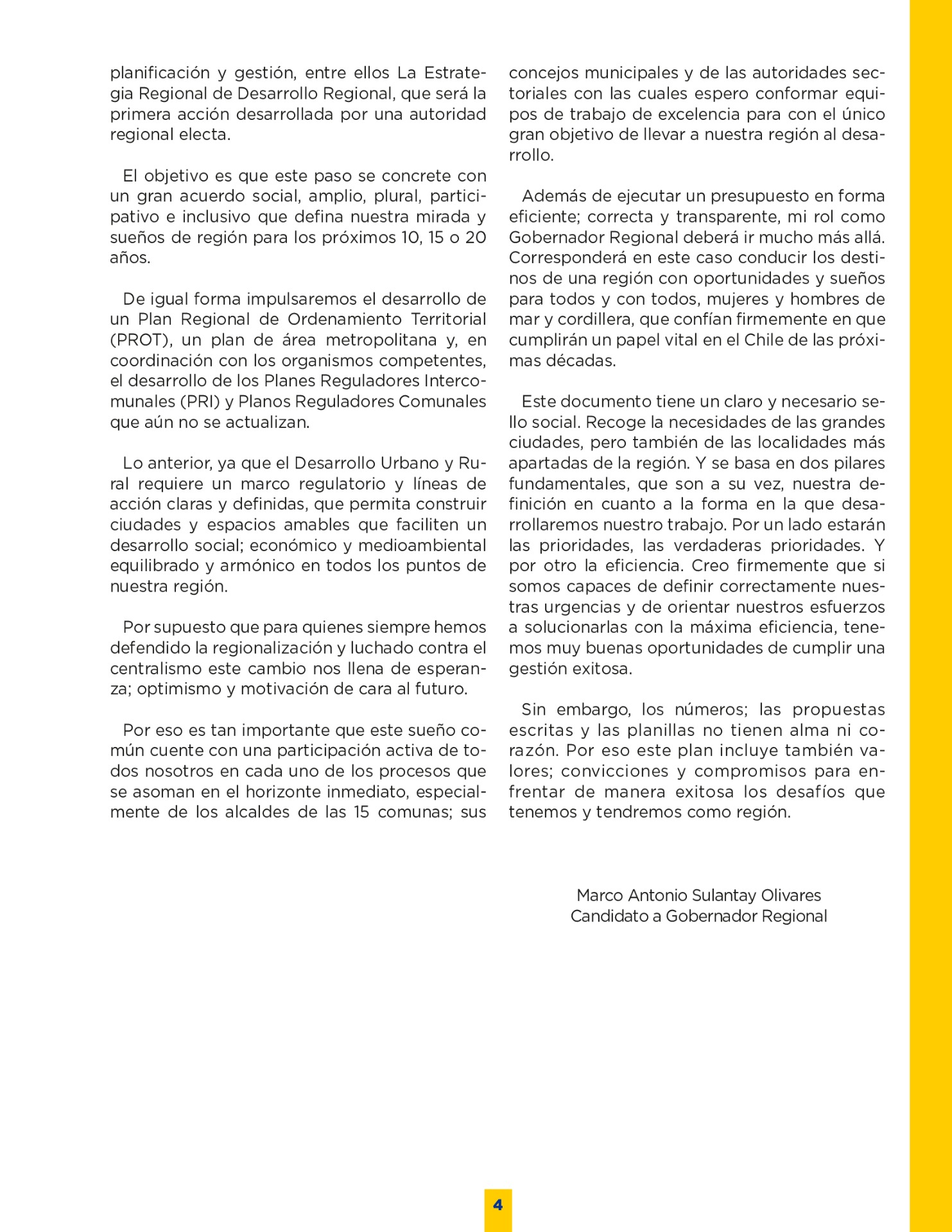 Son muchos los desafíos que tenemos por delante. Sin duda vivimos años difíciles. Pero tengo la convicción que con empeño; trabajo y eficiencia podremos lograr que nuestro territorio se transforme en una región más Desarrollada; equitativa y moderna. Los invito a leer mi programa de gobierno. Es un documento ciudadano, con un claro y sincero sello social, que recoge las inquietudes y prioridades que ustedes mismos me entregaron en nuestro incansable recorrido.