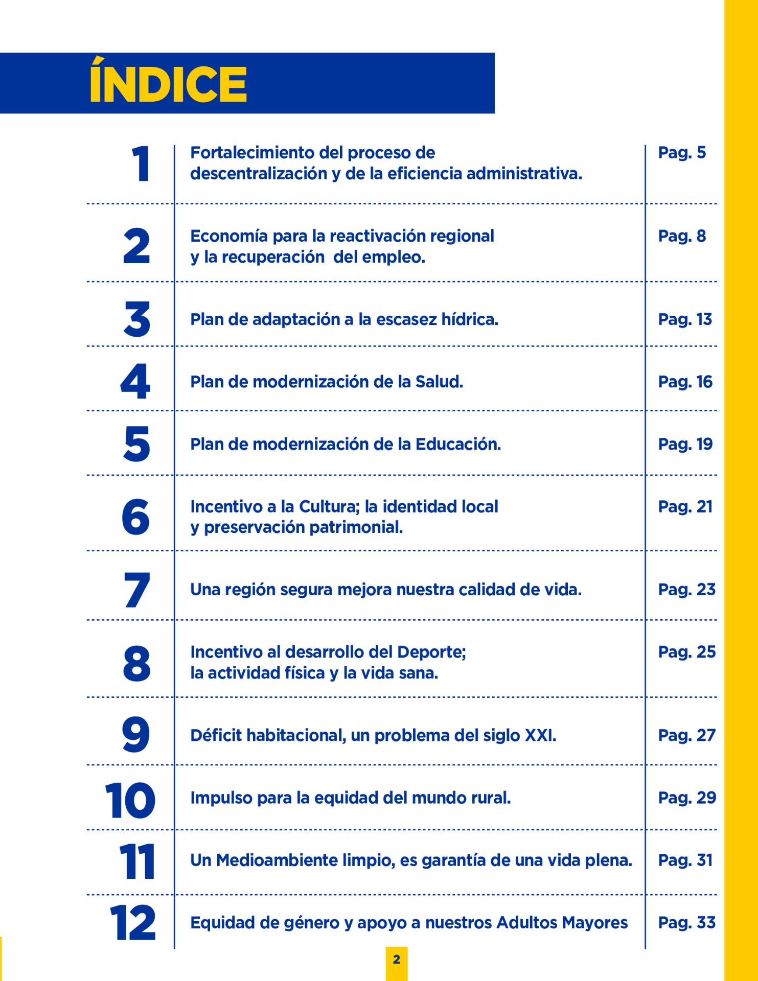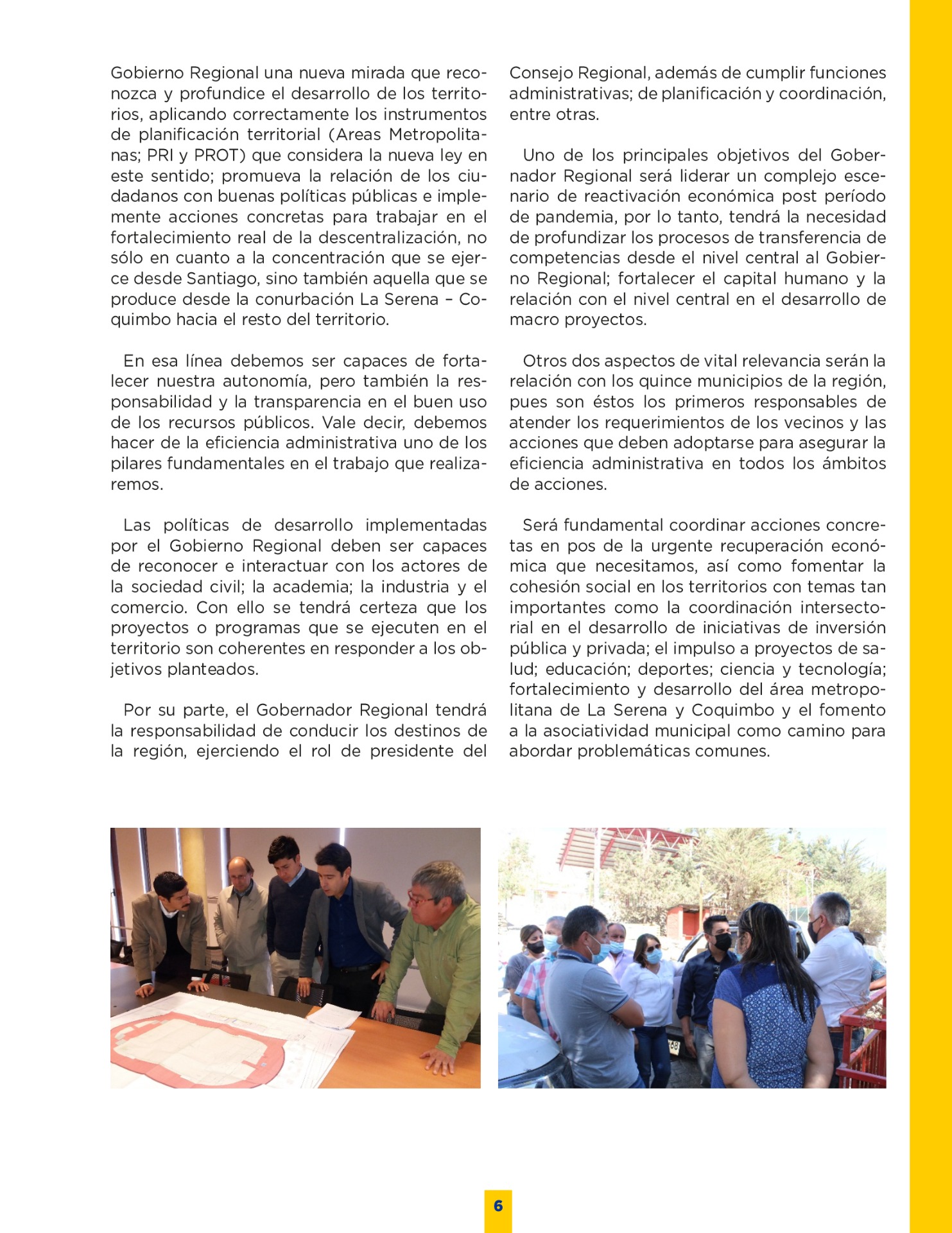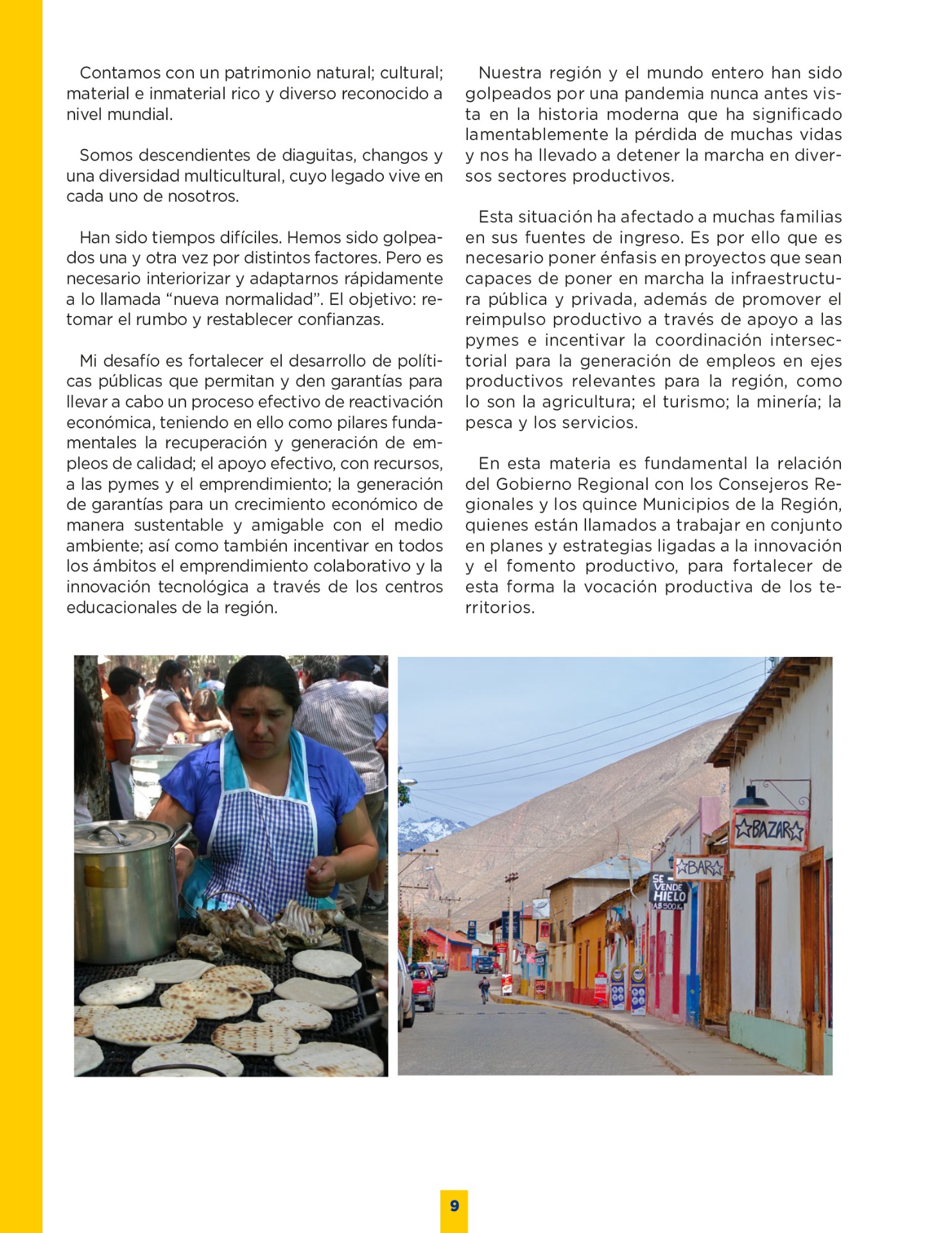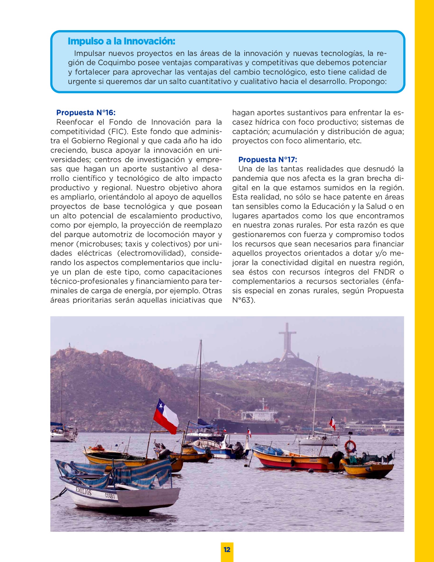 Son muchos los desafíos que tenemos por delante. Sin duda vivimos años difíciles. Pero tengo la convicción que con empeño; trabajo y eficiencia podremos lograr que nuestro territorio se transforme en una región más Desarrollada; equitativa y moderna. Los invito a leer mi programa de gobierno. Es un documento ciudadano, con un claro y sincero sello social, que recoge las inquietudes y prioridades que ustedes mismos me entregaron en nuestro incansable recorrido.
